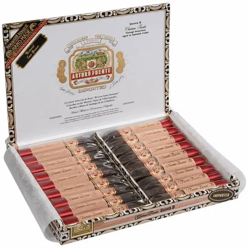 Experience the exceptional quality of the Arturo Fuente Chateau Fuente Queen B Sun Grown, a premium cigar that showcases the legendary craftsmanship of the Fuente family. This distinguished cigar features a beautiful Ecuadorian Sun Grown wrapper over expertly aged Dominican tobaccos, delivering a rich, flavorful smoking experience that has made Arturo Fuente one of the most respected names in the cigar world.